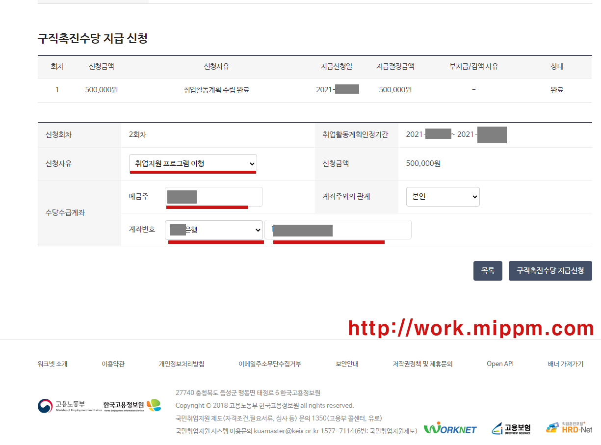 구직촉진수당 지급신청 버튼을 클릭하시면