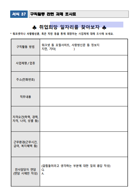 국민취업지원제도-서식-구직활동 관련 과제 조사표 (서식37)