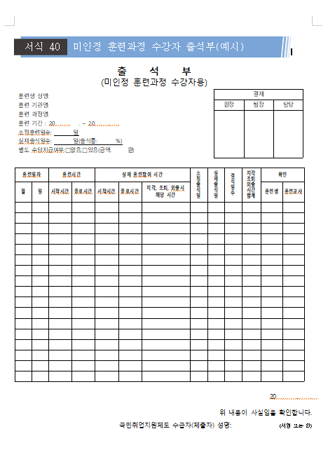 미인정훈련과정의 경우 전산처리및 연동이 되지 않으므로 훈련기관에서 다음양식에 준하는 출석부를 작성하여 훈련기관장의 확인후 제출하여야 출석이 인정됩니다.