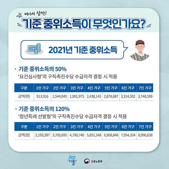 Q. 중위소득 50% 산정은 어떻게 하는 건가?A. 2021년 기준 중위소득표를 기준으로 아래와 같다.
