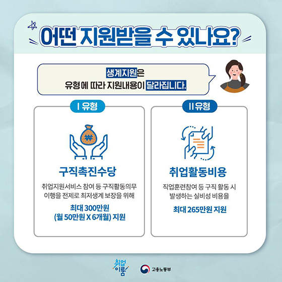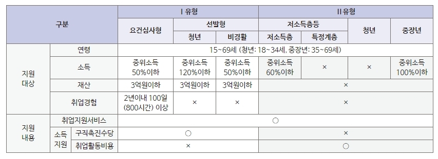 〈Ⅰ유형〉‘구직촉진수당’과 ‘취업지원서비스’를 함께 지원한다.대상 및 지원 내용에 따라 요건 심사형과 선발형 등 두 가지로 구분된다.- (요건 심사형) : 15세 ~ 69세 구직자 중 가구단위 중위소득 50%이하이고 재산 3억 원 이하이면서 최근 2년 이내 100일 또는 800시간 이상의 취업 경험이 있을 것- (선발형) : 요건심사형 중 취업 경험 요건을 충족하지 못한 자 (단, 청년(18세 ~ 34세)은 중위소득 120% 이하)