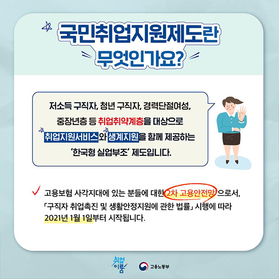 취업을 희망하는 국민이 조속히 취업할 수 있도록 취업지원 서비스와 생계지원을 함께 제공하는 고용안전망 제도이다. 2021년 1월 1일부터 구직자 취업촉진 및 생활안정지원에 관한 법률」에 근거, 한국형 실업부조 “국민취업지원제도”가 시행됐다.