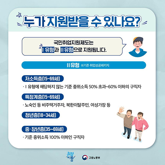 〈II 유형〉취업활동비용 및 취업지원서비스(기존의 취업성공패키지)를 제공한다.Ⅱ유형의 대상자는 Ⅰ유형에 속하지 않으면서 아래 요건에 해당하는 경우다.- (저소득층) : 15세 ~ 69세 구직자 중 중위소득 60%이하, 월 250만 원 미만 특수형태근로종사자, 영세자영업자 등* 특정계층 : 노숙인 등 비주택거주자, 북한이탈주민, 여성가장, 결혼이민자, 결혼이민자 중도입국자녀, 신용회복지원자, 위기청소년, FTA 피해실직자, 건설일용근로자, 국가유공자 가구원 중 취업지원 대상자, 미혼모(부)·한부모, 니트(NEET)족, 영세자영업자, 특수형태 근로종사자 등- (청년) : 18세 ~ 34세- (중장년) : 35세 ~ 69세, 중위소득 100%이하