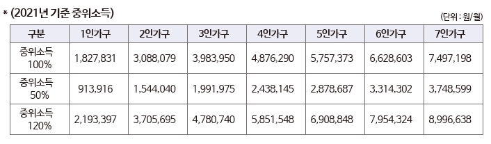 Q. 중위소득 50% 산정은 어떻게 하는 건가?A. 2021년 기준 중위소득표를 기준으로 아래와 같다.