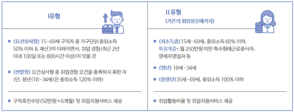 1유형 : 중위소득 50%이하, 재산 3억이하, 최근 2년이내 100일 또는 800시간 이상의 취업경험