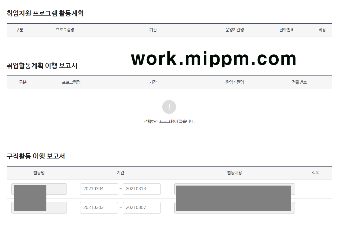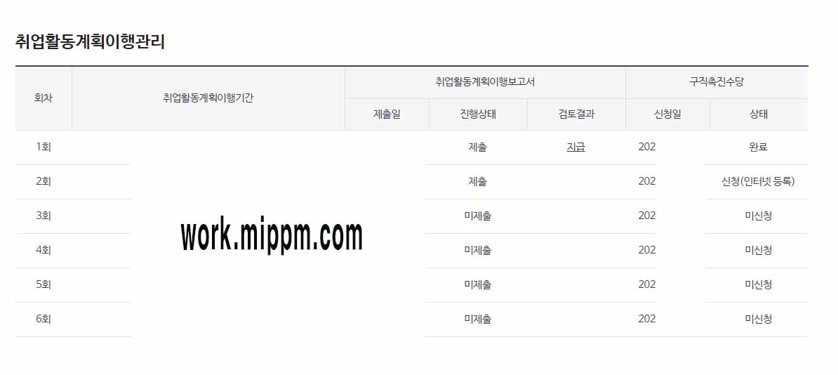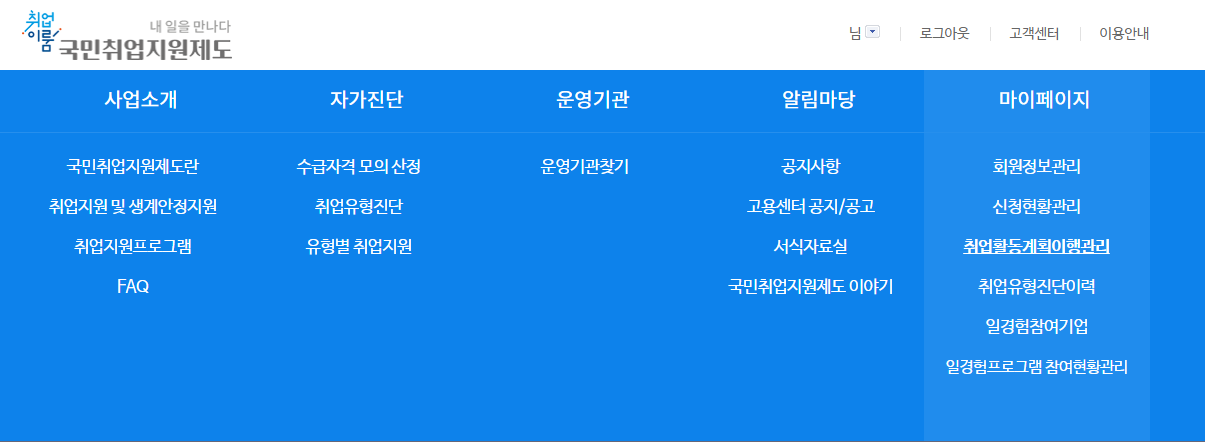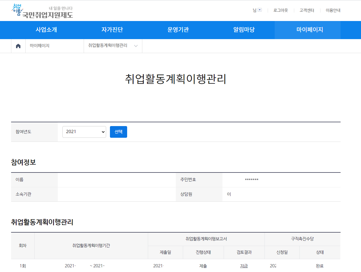 국민취업지원제도> 마이페이지 > 취업활동계획이행관리 를 클릭하면