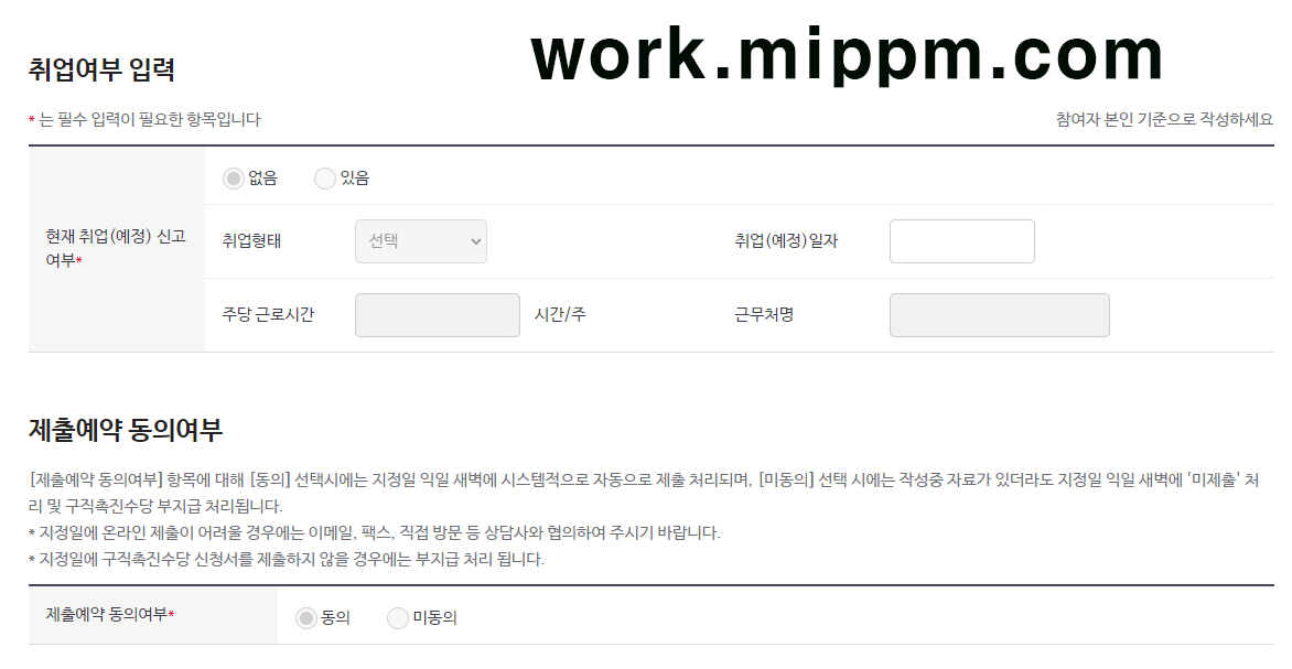 만약, 현재 회차를 진행하며 취업이 되었거나 취업예정인 경우 취업 유무 란에 입력해야 합니다.