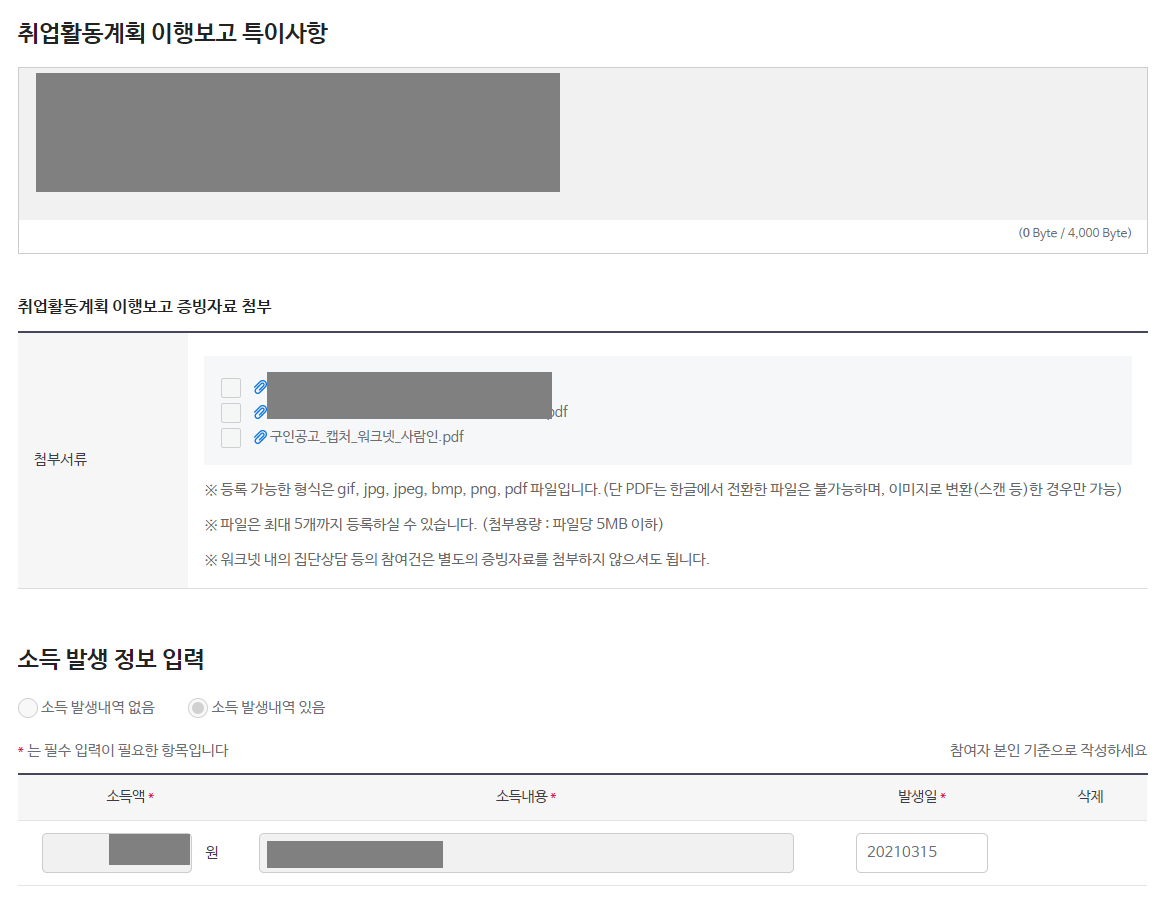 취업활동 계획 이행보고 증빙자료가 필요한 경우 첨부파일로 넣어주시면 됩니다.