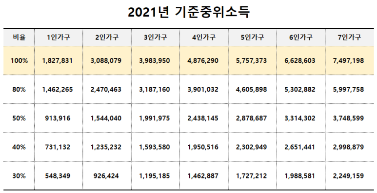 2021년 기준중위소득 표입니다.